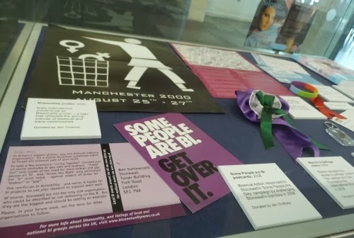 No, he was bisexual... of course at the time both of them were in the closet... the word dates back to the late 1800s... that's the wrong pronoun... I'll shush now.Those exchanges of stories highlighted some of the limitations of the rapid recruit - prepare - present cycle. We had, from what I could tell, a skew toward cis lesbians and gay men among the volunteers. That's not to bemoan any of them being there, just that as so often, ideally there would have been more and different voices. Thanks to my background and extensive if ill-filed bi archives I can hold up the B end well, but I think there was only me and one ally speaking up on trans issues and representation. There was at least some B and T in there though, which was one of the things that made me glad I'd taken part. Especially seeing this little "bisexual corner" with two of my final three nominated items for the display, one of which reflecting the internal struggles within the LGBT umbrella: